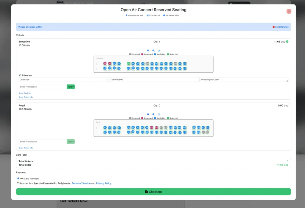 2. On the checkout popup, view the reserved seating chart for each ticket type.