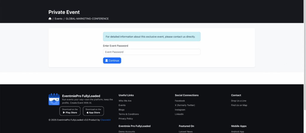 To access a private event, use the unique Event URL. If the event is password protected, you must enter the password to view the event page.