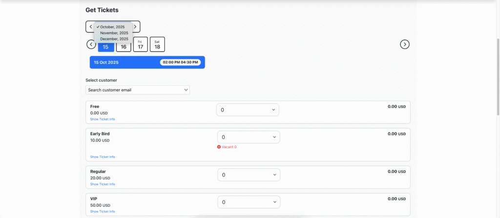 On the Checkout Popup, Vacant Seats are shown for each ticket if the Total Available Ticket Quantity is less than the Max Ticket Qty Limit Per Order (Admin Panel -> Settings -> Booking Tab -> Max Ticket Qty Limit Per Order). This ensures only limited ticket availability is displayed, protecting your inventory details.