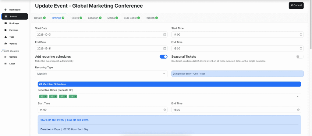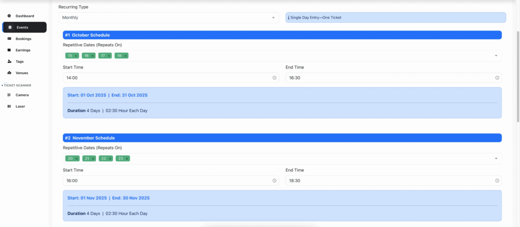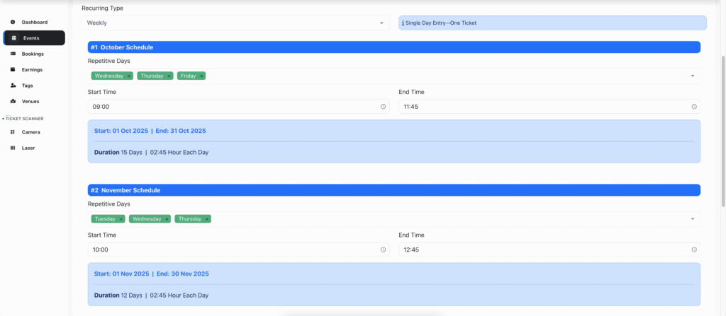 Effortlessly schedule and manage daily, weekly, or monthly recurring events with Eventmie Pro’s Repetitive Events feature. Perfect for fitness classes, educational courses, webinar series, and any event that repeats on a regular basis, this feature maximizes attendance, automates your workflow, and delivers a seamless experience for both organizers and attendees.