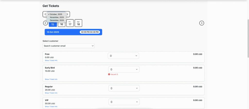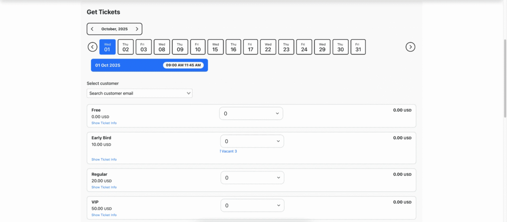 In the Event Schedules, if all tickets for a specific timeslot/date are booked, that timeslot will display as Sold Out.